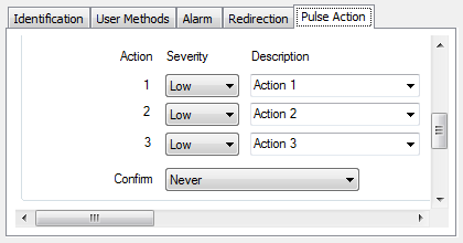 Use the fields within the Actions section of the Pulse Action tab (or the <Pulse Type> tab on some drivers) to define the action(s) that can be undertaken by a pulse action point.