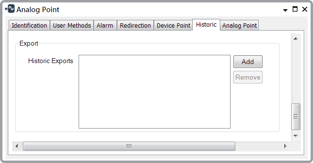 - Historic Exports—Use to specify the historian application to which you want to export the point or accumulator data. You can specify more than one historian application (see Array Field in the ClearSCADA Guide to Core Configuration). The field lists the historian applications to which the point or accumulator currently exports data.