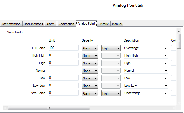 You configure each analog point on your system by using the fields on the appropriate Analog Point Form. Each Form has several tabs, which you use to define different aspects of the point configuration.