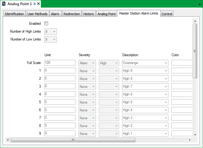Once enabled, an additional Master Station Alarm Limits tab becomes available on the Analog Point Forms on your system.