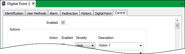 Digital points on simple drivers that support controls, and output points on some advanced drivers, include an Enabled check box at the top of the Control tab. If a point is set up as an output point and is to be controlled by ClearSCADA, select the check box to enable the control feature for that point.