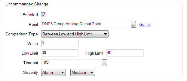 - Next, we will specify the Uncommanded Change point. In this case, we will use the analog output point associated with the device - but we could have created a new point for this or used another suitable existing point in the database. We select the browse button to the right of the Point field to display a Reference browse window, then select the point from the displayed list. In this case, the DNP3 analog output point.