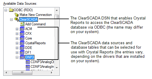 In order to use ClearSCADA data in a report, the Crystal Reports application needs to access the ClearSCADA database. In order to do this, you need to specify an ODBC connection to the database. You need to specify this connection whenever you create a report or subreport.