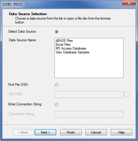 If a connection already exists to the ClearSCADA database, an appropriate entry will be displayed here—see Provide Access to the Relevant Database Tables. If no connection exists, the ODBC (RDO) window is displayed.