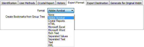 Use the Format field on the Export Format tab of the Crystal Report Form to define the format in which a report is to be exported using the Export Report pick action.