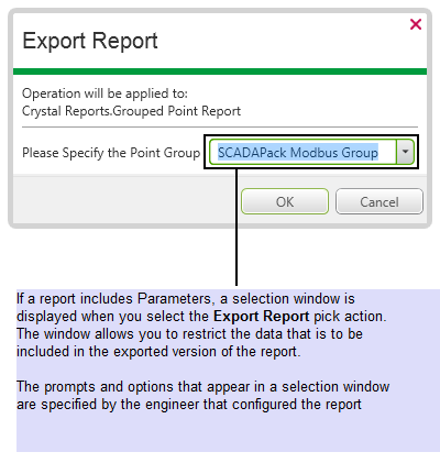 If a report uses Parameters (see Parameter Field), a window is displayed whenever the Export Report pick action is selected. The window allows you to restrict the data that is to be exported. The prompts and options that appear in such a window are specified by the engineer that configured the report parameters—see that engineer or a system administrator for further information.