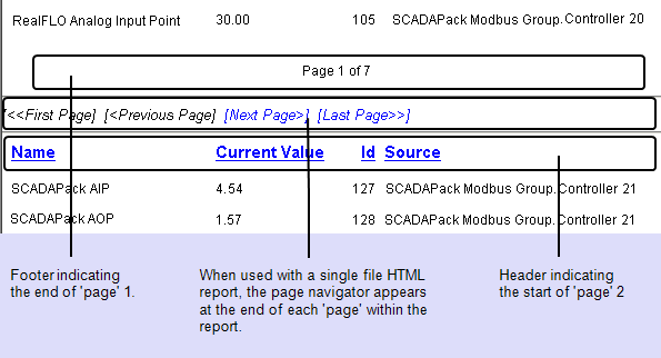 - Separate HTML Pages—Select this check box for the report to form one or more separate HTML pages, when it is exported to HTML format. Each page forms a separate HTML file. As such, if you have a seven-page report, ClearSCADA exports the report as seven separate HTML files, with each file name comprising the report name, followed by a number (1 to 7). You can specify a Page Navigator (see above) in order to navigate between the HTML files.