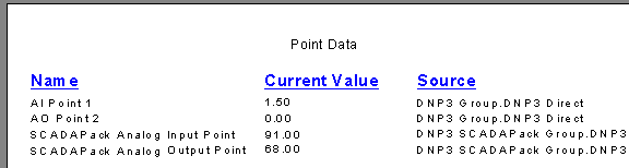 The resulting report lists only those points that appear within the Groups that start with the name ‘DNP3’: