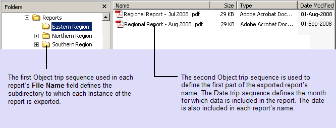 When each report is exported using the Schedule, it is automatically exported to the subdirectory that has the same name as the Group Instance with which the report is associated. As such, in this example, the Regional Report for ‘Eastern Region’ is exported to the location \\GRBServer\Reports\Eastern Region\, while the Regional Report for ‘Northern Region’ is exported to the location \\GRBServer\Reports\Northern Region\, and so on.