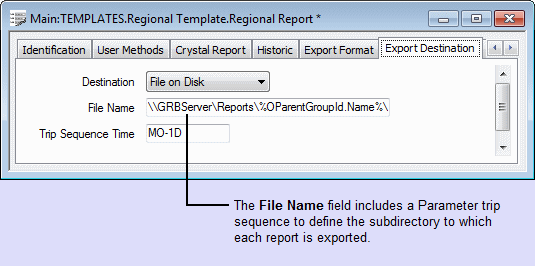 In the Group Template, the File Name field on the report’s Export Destination tab is used to specify the location to which the report is to be exported.