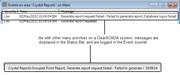 If report generation fails, a diagnostic message appears in the Status bar and is logged in the Event Journal. The diagnostic message summarizes the reason that the server failed to generate the report.