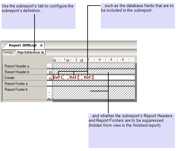 A subreport is added to the primary report, in order to include the grid reference data. (To add a subreport to a primary report, select the Insert Subreport button in the Crystal Reports application, or select the Insert menu, followed by the Subreport option.)