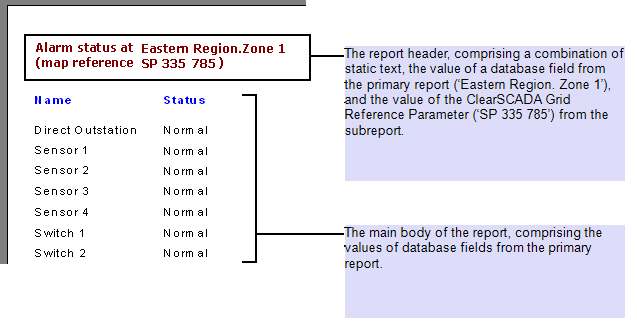 Each ClearSCADA Grid Reference Parameter stores data that specifies the geographical location in which an area of plant is located. However, that map reference data is not directly related to the database records that store the actual plant data—there is no direct link between the database table that stores the grid reference data, and the database tables that store the plant data for a particular zone. Therefore, in order to include the ClearSCADA Grid Reference Parameter data in a report, that data is included in a Crystal Reports subreport.