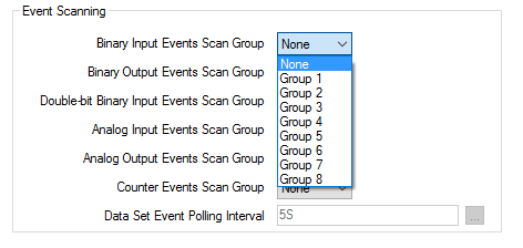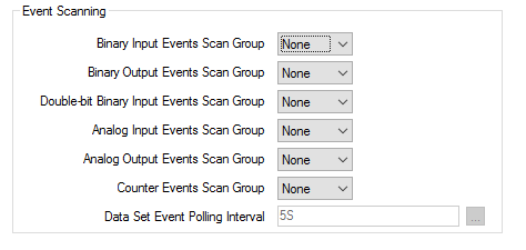 DNP3 Event Scanning requires DNP3 Level 2 support at the outstation. If the outstation does not support DNP3 Level 2, set these fields to ‘None’.