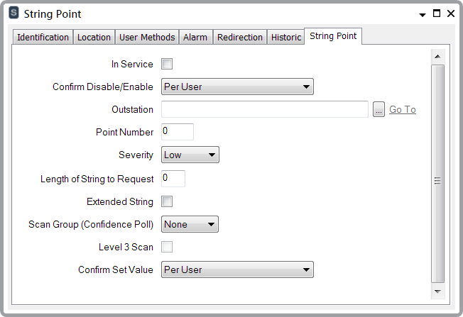 - Extended String—Select this check box if the outstation supports extended strings and has an extended string at this address. If you select this check box, the Length of String to Request field will be grayed out (that is, it will be unavailable).