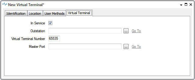 - Virtual Terminal Number—Allocate a unique ID number to the virtual terminal. The number is used to uniquely identify the outstation port through which communications are being routed. The number has to be the same as the port identifier for the outstation. Where the port is on a DNP3 Slave outstation, the Virtual Terminal Number has to be identical to the Point Number on the corresponding VT Service Port Slave Form (see Configure a VT Service Port Slave).