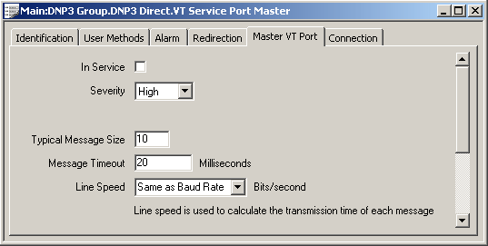 - Line Speed—Use to specify the speed of the slowest part of the connection between the ClearSCADA server and the external application, so that ClearSCADA can correctly calculate the transmission time for each message that is transmitted via the service port.