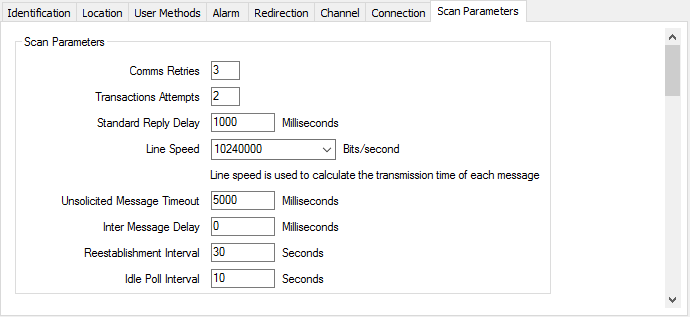 Use the fields within the Scan Parameters section of the Scan Parameters tab to configure the basic communications settings for the channel. The fields are common to channels on many advanced drivers (see Defining Scan Parameter Settings for a Channel).
