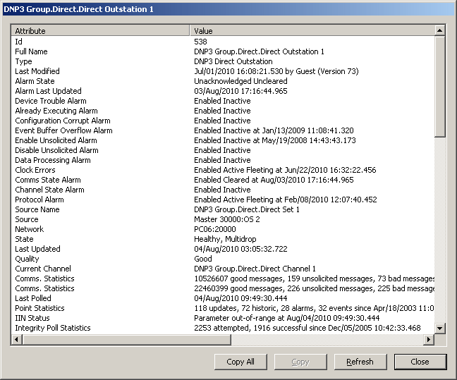 The Status display for each DNP3 outstation provides information about the present state of the individual outstation.