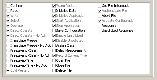 The DNP3 standard mandates that certain function codes (such as ‘Cold Restart’) to always be deemed critical. The check boxes for these function codes are ‘grayed out’ to indicate that they cannot be cleared.