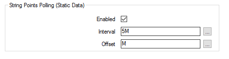 Specify how often ClearSCADA polls the outstation for static String point data. Such polls may result in large quantities of data being returned to ClearSCADA. If an outstation has a large number of String points, carefully consider the frequency with which ClearSCADA should poll the outstation for String data. Depending on link speed, you should specify an interval of several minutes or hours for those outstations that have a large number of string points. Enter the time in the OPC Time Format, for example 5M (for five minutes). You can enter the value directly in the field, or use the Interval Window (accessed via the field’s browse button) to specify the required value.