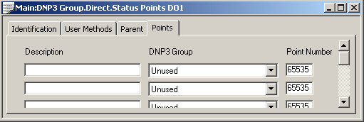 Use the Points tab on the DNP3 Status Points Form to specify up to 10 Status Points for which ClearSCADA is to retrieve data. For each Status Point, you need to configure the following: