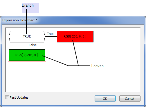 The True leaf sets the color to be red and the False leaf sets the color to be green. This means that if the digital point has an uncleared alarm, the FillColour animation will have RGB (255, 0, 0) as its value (red) and if the digital point does not have an uncleared alarm, the FillColour animation will have RGB(0, 255, 0) as its value (green).