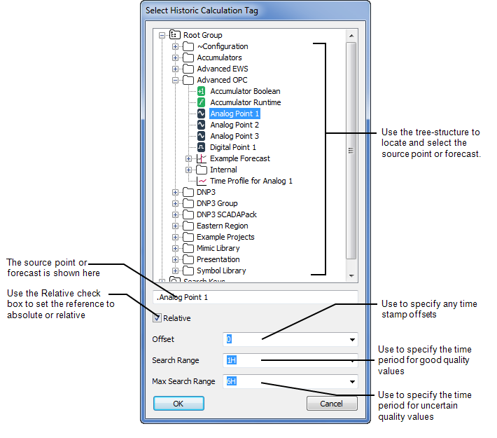 You can use the Select Historic Calculation Tag window to select the source point or forecast, time offset, and quality windows for a historic calculation's expression (see Selecting a Historic Calculation Tag).