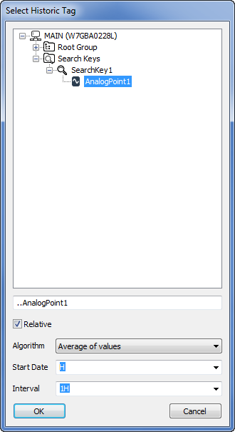 When you select a search key in the Select Historic Tag window, you can define which historic values you want to use, and what calculation you want ClearSCADA to perform on them. To do this, you can use the Algorithm field to choose the type of calculation, the Start Date to define the earliest value you want to use and the Interval to define the entire range of historic values to be used. For example, if you select a search key named HisAVE and select Average of Values for the Algorithm, H as the Start Date and 1H as the Interval, the expression will return the average value of the item that has HisAVE as its value for the search key. The average value will be calculated using the historic values from the start of the current hour up to the end of the current hour.