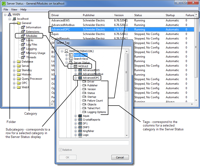The relationship between the Select Tag window (or OPC data window) and the Server Status Tool (see Working with the Server Status tool) is illustrated below.