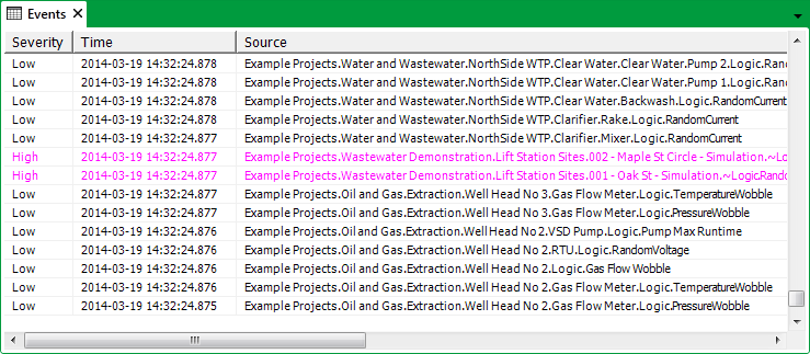 An Events List is displayed. The List shows event messages that have been logged on your system within a specified time period (the Event List Range specified on your User Account (or the Guest User Account if you are not logged onto ClearSCADA)).