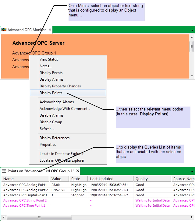The outstation entry on a Mimic is configured to display an Object Menu. An operator clicks on the outstation name to display a menu, then selects the Display Points option to display a List of the points associated that outstation.