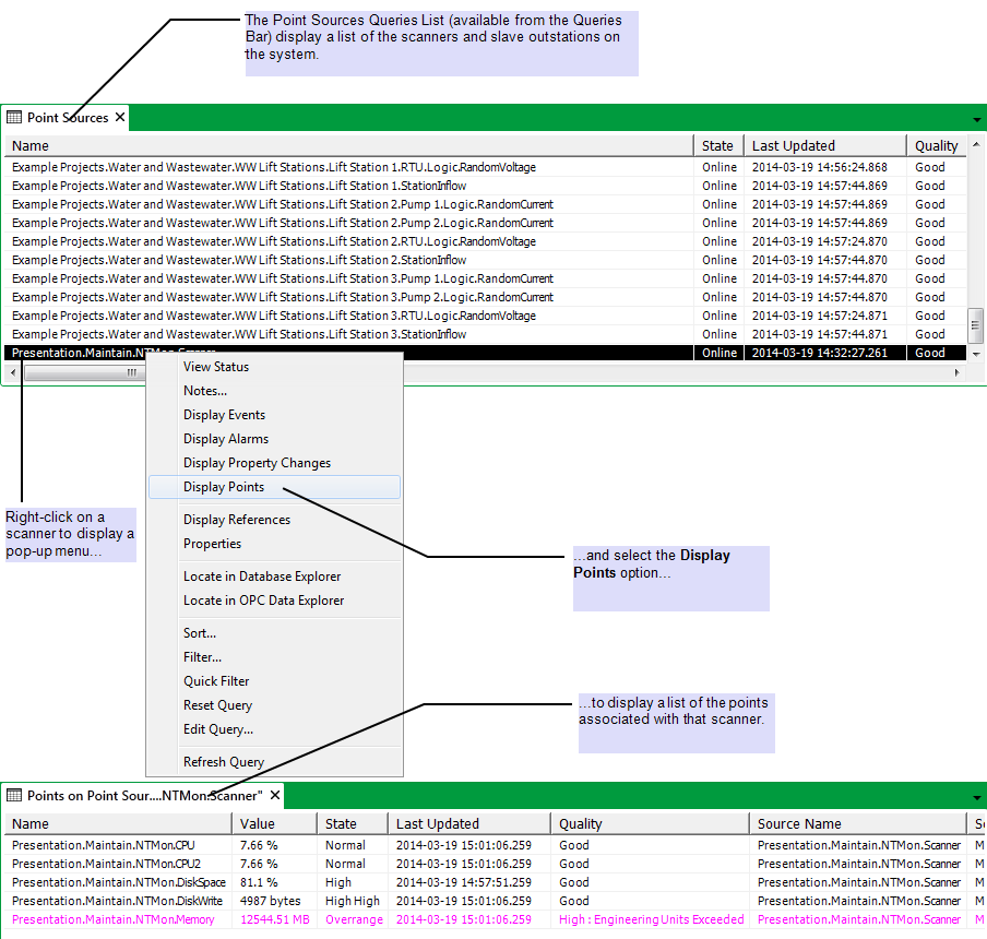 By right-clicking on a scanner on the Point Sources Queries List and selecting the Display Points menu option, an operator is able to display a List of the points that are associated with that scanner.