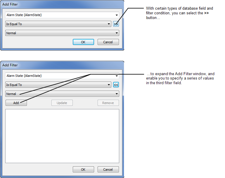 - Use the text entry field or combo box below the >> button to define the first value (in the same way as you would define the value if you were only defining one filter value).