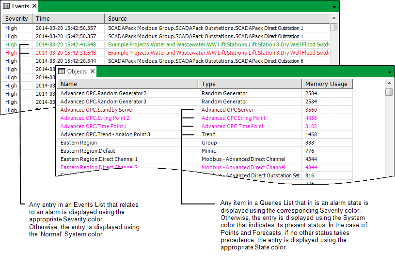 The color that ClearSCADA uses for displaying an entry in a List is determined by that entry’s state and, in the case of a Queries List, any actions that are being performed on, or associated with, the item. The exception to this is any ‘custom’ Lists (see Custom Lists) or high-level ‘standard’ Lists that have not been configured to use the relevant database table’s Foreground, Background, and Blink fields to control each List entry’s color (for example, PSTN Call Statistics Lists do not use these fields).