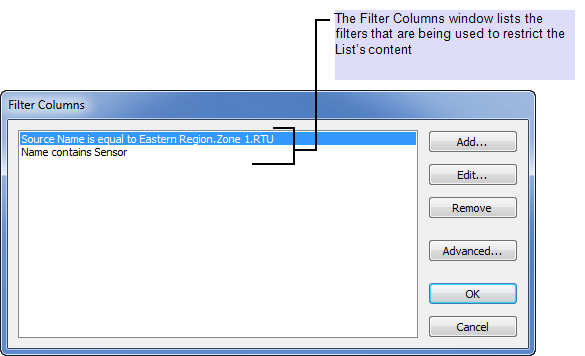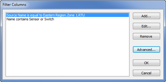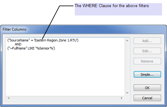 When displaying a List such as an Events List, Alarm Summary, Queries List, or Historic List, you can use the Filter Columns window to apply the filter criteria (see Filter a List). When using the Filter Columns window, you can choose to apply the filter settings by using the various combo boxes and fields, or you can select the Advanced button. This button provides access to the SQL text entry field, enabling you to define the filter criteria as an SQL query WHERE Clause. (To revert back to using simple filters, select the Simple button on the Filter Columns window.)