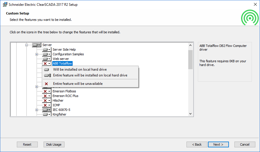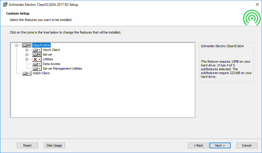 ClearSCADA allows you to select the components that you want to install on the server and clients by selecting the Custom installation option. When you choose Custom on the Choose Setup Type ‘page’, the Custom Setup ‘page’ is displayed.
