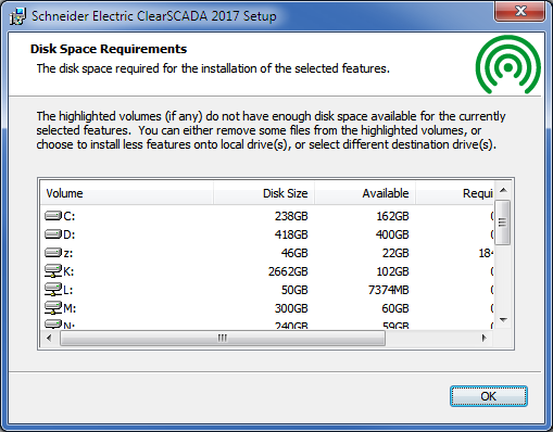 For information on the amount of disk space required for the installation you have chosen, select the Disk Usage button. This displays the Disk Space Requirements window, which shows any volumes that have insufficient space available.