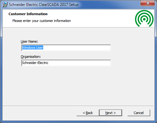 On the Customer Information ‘page’ of the ClearSCADA Installer, enter your name and company name in the User Name and Organization fields.