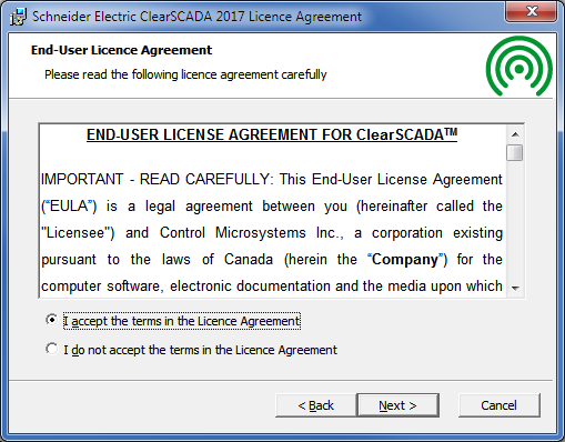 If you do not agree to the stated terms, select I do not acknowledge the terms in the License Agreement. You will be unable to install ClearSCADA and the installation process will end.