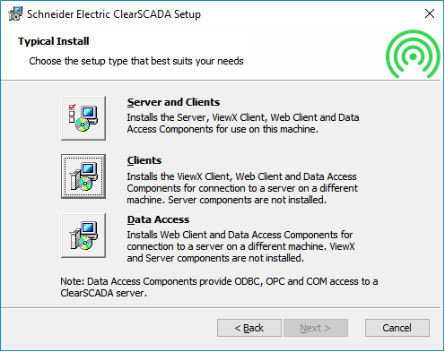 Select this option to install the most commonly used server and client components. These include ClearSCADA server, ViewX, WebX and Data Access.