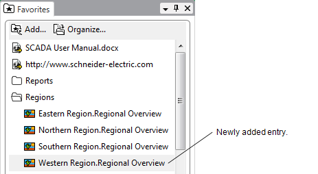 You can add entries for many types of ViewX display to your Favorites List. Once you have added a display’s link to your Favorites List, you can use the link to access that display from the Favorites Bar. This saves you having to locate the document using other means, such as the Database Bar, or a link on a Mimic. You can also add entries to your Favorites List that allow you to display multiple ViewX documents simultaneously (providing that your user account enables Multiple Document access).