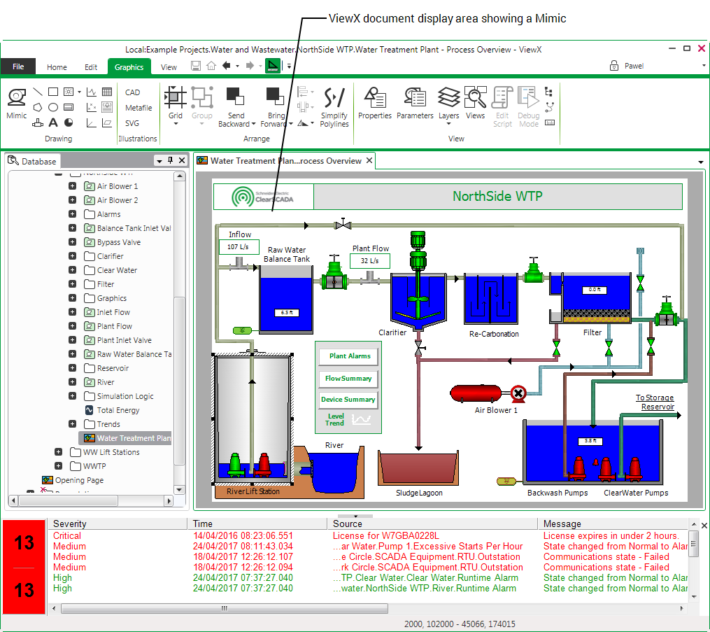 Typically, you will perform many of your tasks from Mimics, Trends, and Lists that are shown in the ViewX document display area.