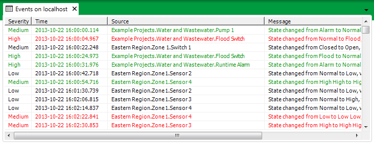 The entries in the Events Lists are displayed using colors that indicate whether any of the events are associated with alarms (see Alarm Status).