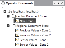 Typically, a user that logs on via an operator level user account does not have the Configure Database permission and so can only view and operate the items in the database. The Operator Document Store feature allows an operator level user to create and edit certain types of documents, such as Trends, and save them in the operator document store. These documents can then be viewed and edited by any user with access to the operator document store.
