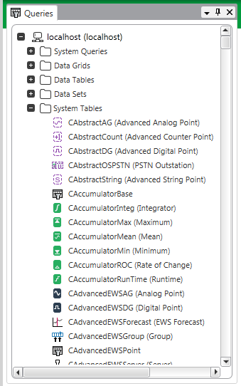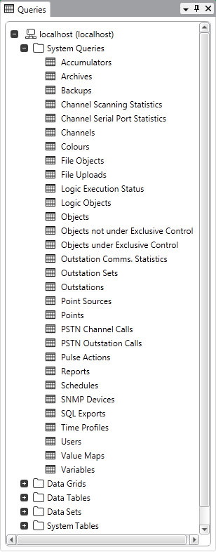 The System Queries branch comprises tables of the various types of database item that exist on your system, such as users, points, and channels. The entries in the System Queries branch vary, depending on the database’s configuration and the drivers that are installed. The data in the tables is pre-filtered—when you display the data in List format, only the type of data that applies to each of the items in the table, and which is deemed to be of greatest use, is included in the List.