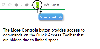 The appearance of the Quick Access Toolbar will change if the space across the width of the ViewX window becomes limited. As the ViewX window narrows, commands may no longer display. If this occurs, you can access the hidden commands from the More Controls button.