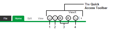 The Quick Access Toolbar is a customizable toolbar that provides immediate access to frequently used commands. It is located by default on the ViewX window title bar.