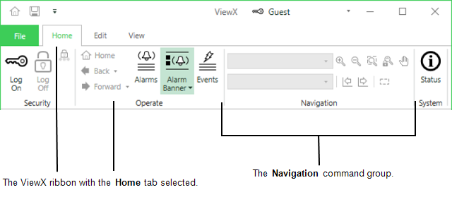 The tabs and commands that the ribbon contains varies according to your security level and the type of display currently selected in the Document Display Area. For example, if you log on with the Guest user account (with the default settings), you will see the Home Tab, Edit Tab and View Tab.