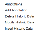 With pre-configured Trends, a context-sensitive menu is displayed to the top-right of the document display area. Use the menu options to perform activities specific to the Trend database item (as opposed to the actual Trend display). For more information, see Access Context-Sensitive Menu Options on a WebX Client.